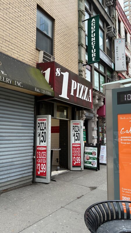 Plenty of shops still have the old signage — proudly painted “$1/Slice” in bold lettering. But the fine print is reality: it’s more like $1.50 and up these days. We kept finding ourselves at Little Italy Pizza on 2 E 33rd St — a small chain spot where slices were going for as much as $5.